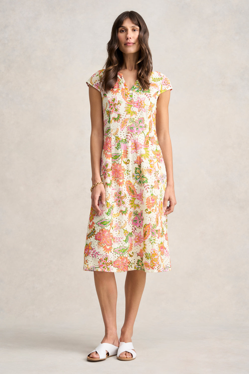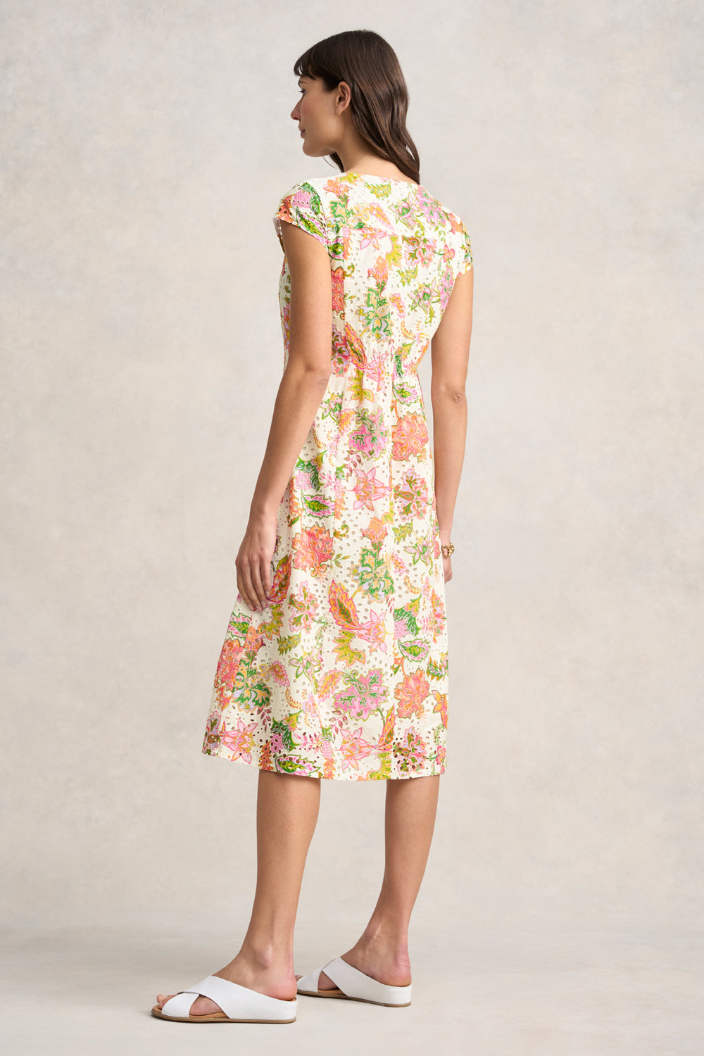 Step into event season in style with our Broderie Printed Dress. Featuring a delightful floral print with a fresh white base that’s perfect for warmer weather, this midi-length dress offers a flattering fit and flare silhouette, cap sleeves and notch neck. This beauty can easily transition from casual events to more dressy occasions.