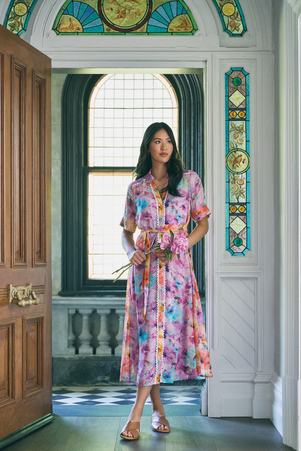It’s loud and it’s playful! Introducing our new shape, Spliced Print Shirt Dress, designed for the modern woman who values both style and comfort. In a flattering midi-length with a trapeze silhouette, this dress features moody aubergines and cool tones contrasted with white lace details and warm-coloured panels in peach and orange. Tie the matching belt your way to complete a bold summery look.