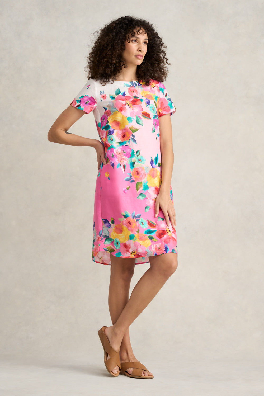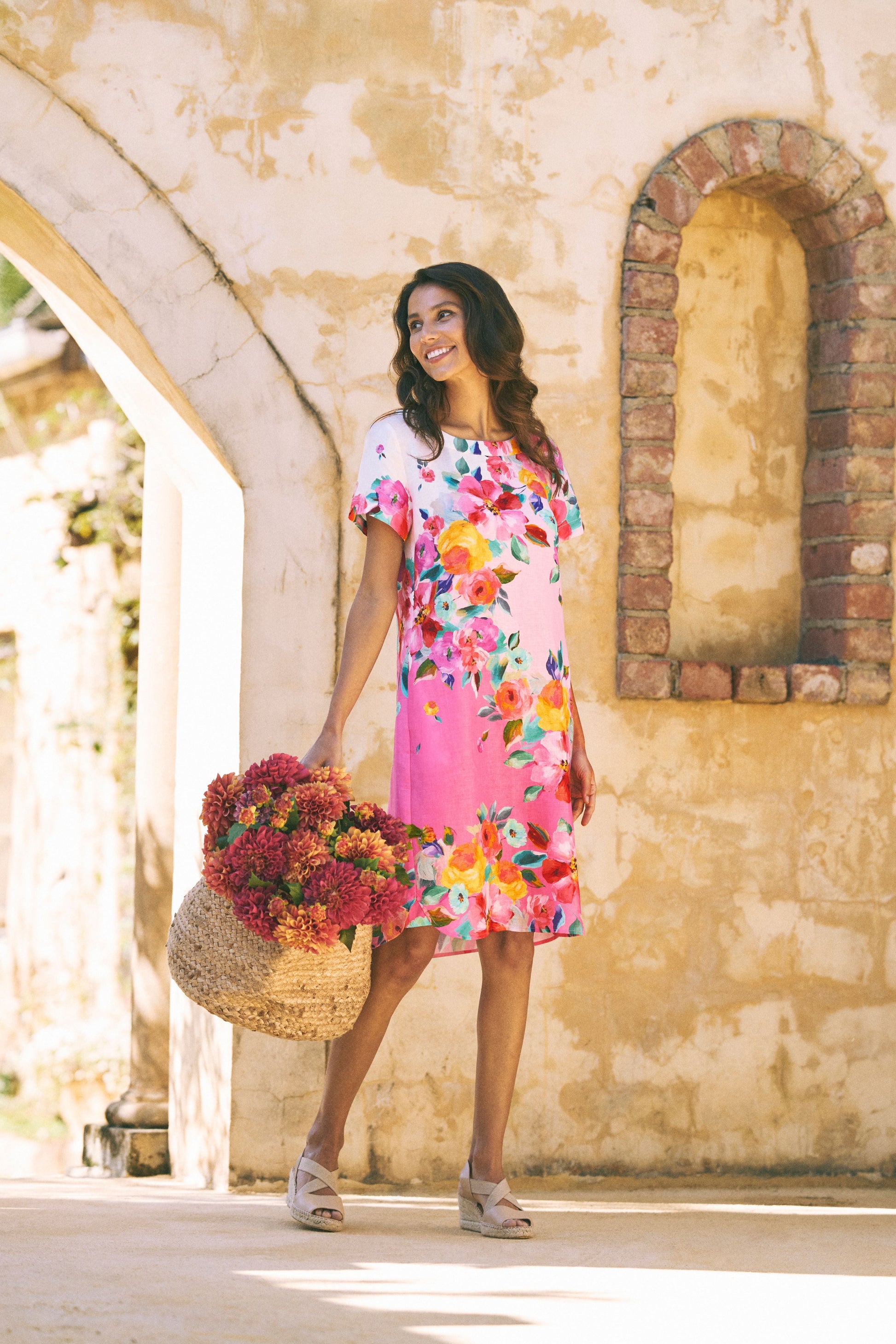 Crafted from 100% French linen, this shift-shape dress is a comfortable and colourful piece that will soon be on high rotation in your wardrobe. Featuring the cascading Rose Border print of our latest collection, accessorise this dress with our Kira Woven Handbag and your favourite sandal or espadrille.