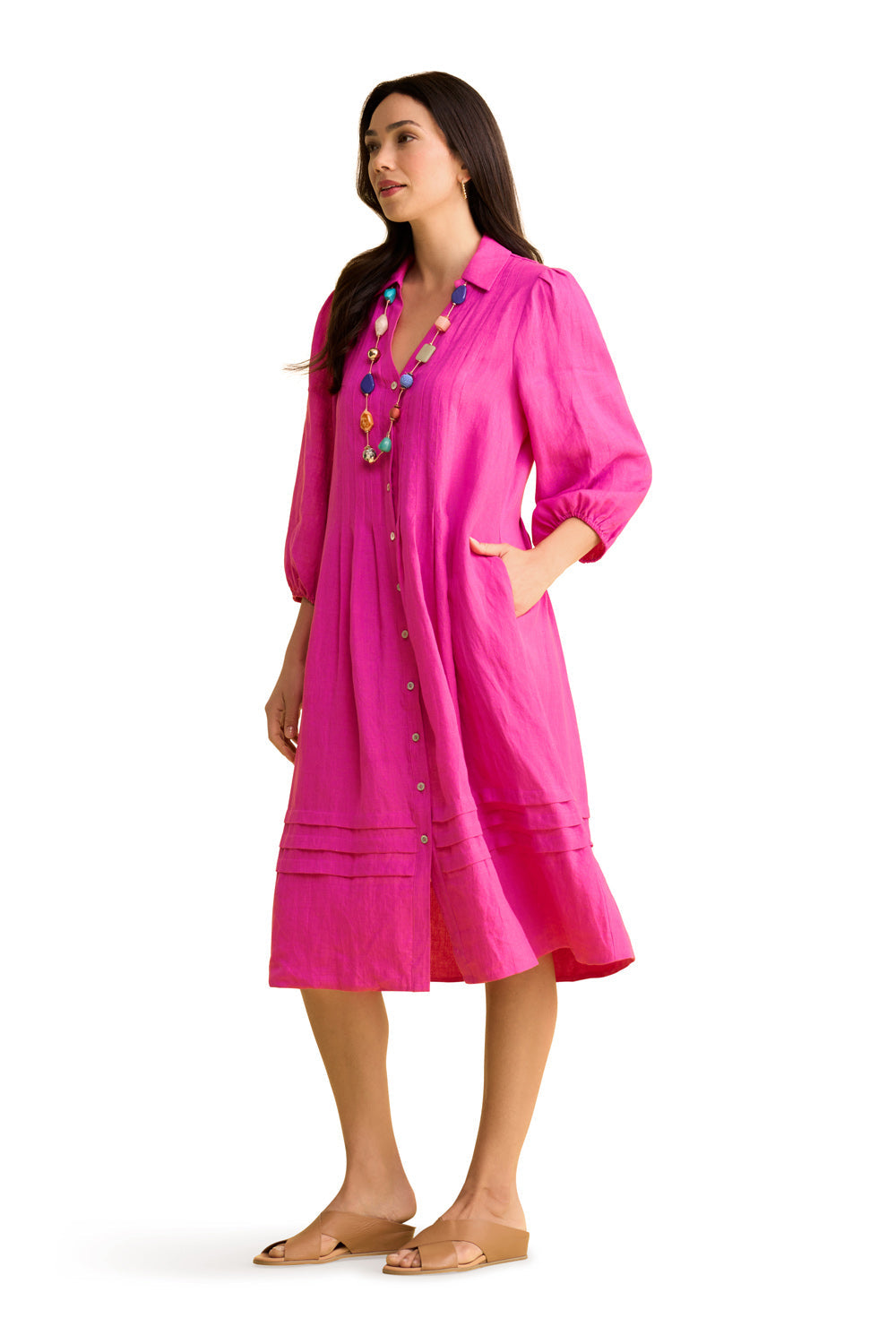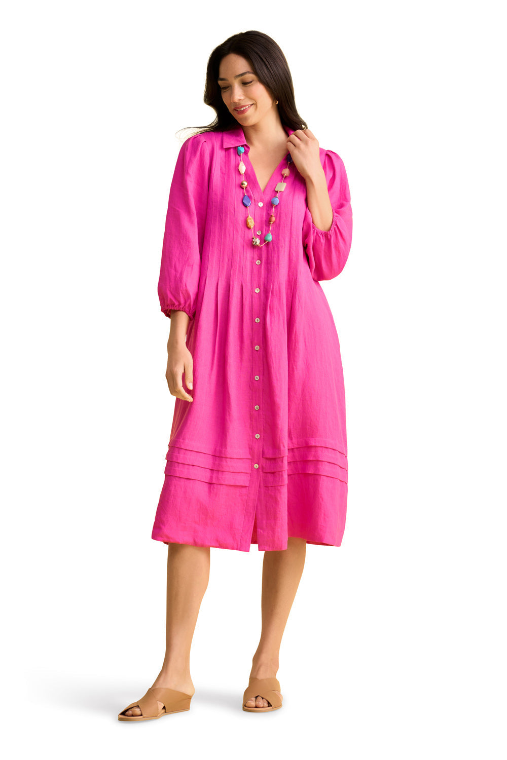 Our French Linen Puff Sleeve dress in Bright Rose is a stylish affair. With an open shirt collar, notched neck and stylish ¾ sleeve with elasticated cuff, this is a midi-length dress that can be easily dressed up or down with your favourite accessories. It’s summer special event outfitting made easy!