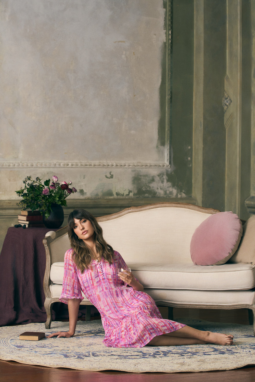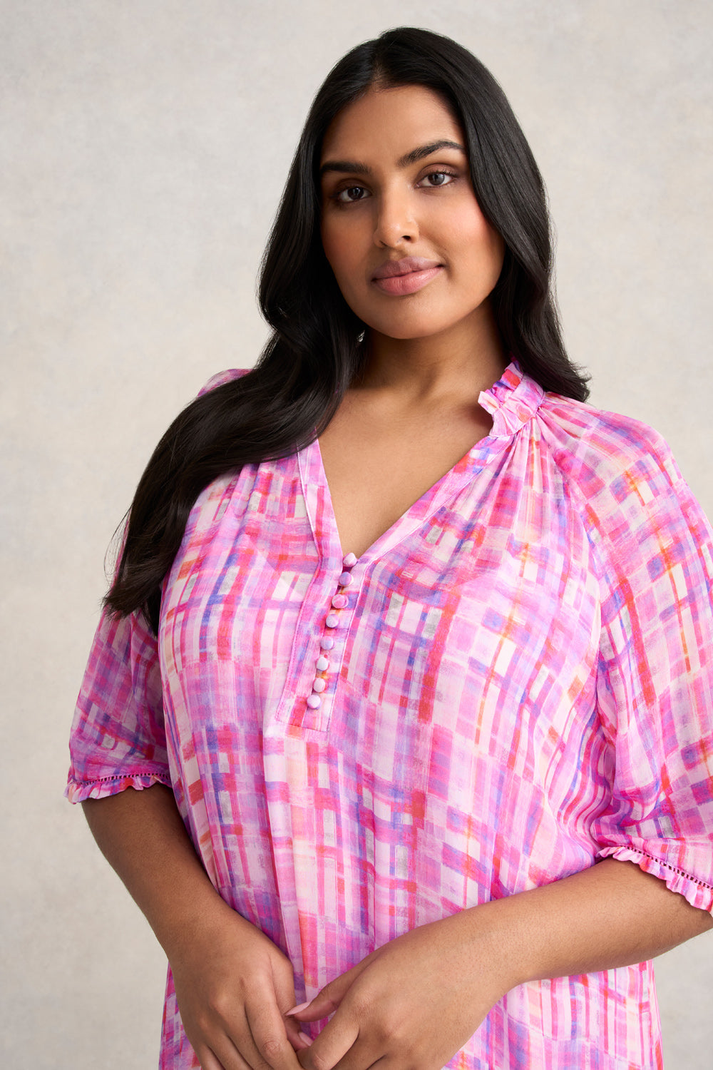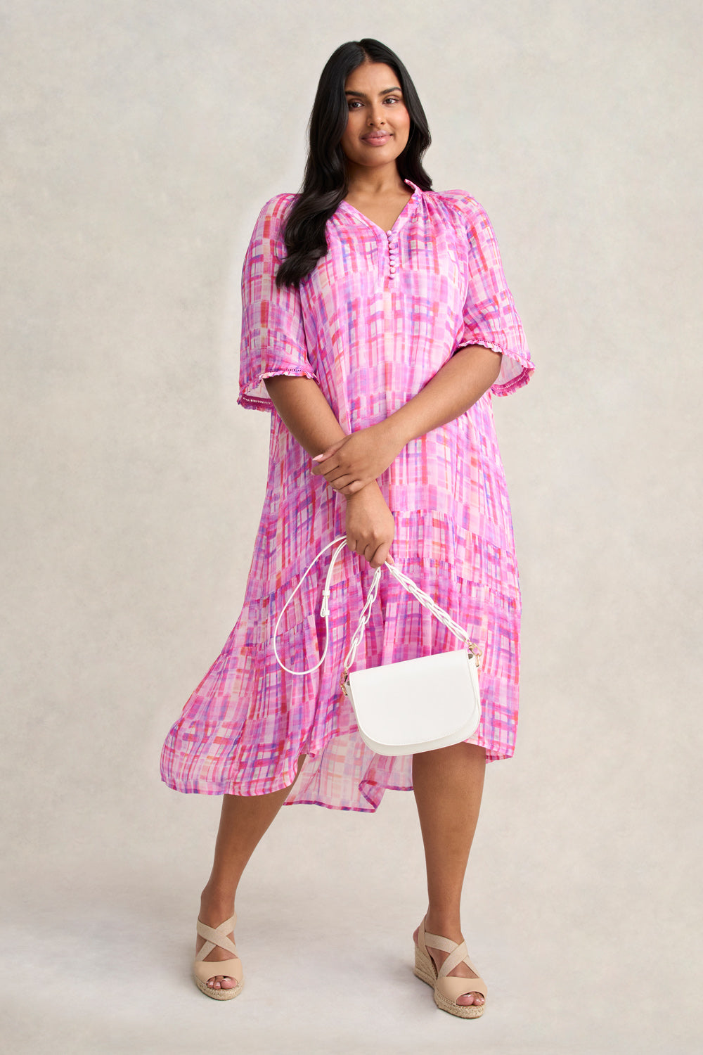In a timeless silhouette featuring confectionery colours, comes the return of our charmant Georgette Ruffle Dress in the new Abstract Check design. With a flattering notch neckline, ruffle detailing on the sleeve and ladder lace insert, wear this dress with your favourite sandal or espadrille for a carefree spring look.